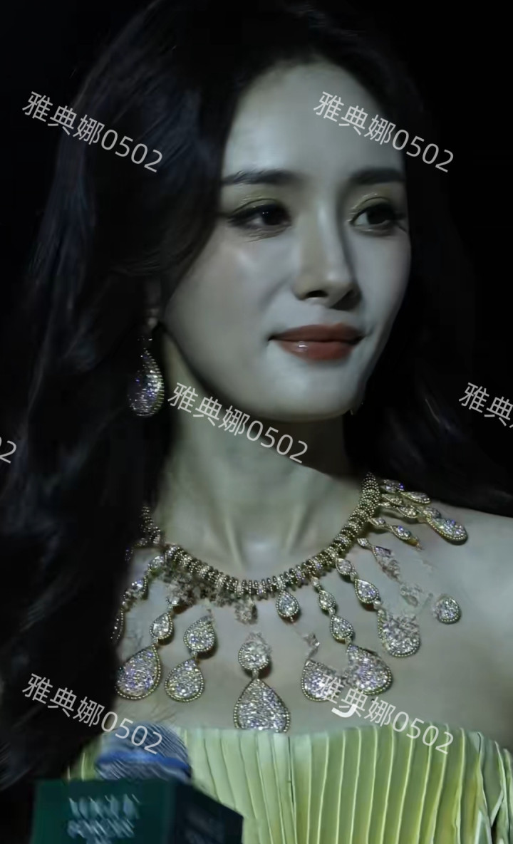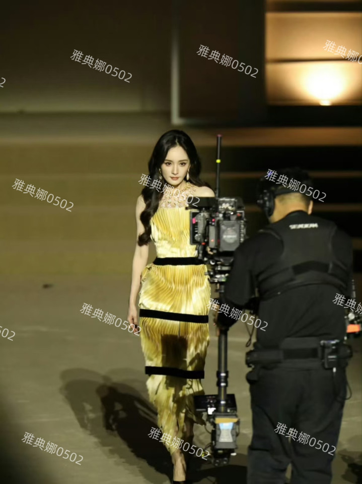 杨幂的服装表达则略显含蓄,并没有直接的使用鲜花元素,百褶造型的金色礼服被专业人士解读为鎏金玫瑰,配上整套的金色珠宝,连眼影都是bulingbuling金灿灿的,即使在很黑暗的灯光下也熠熠生辉。